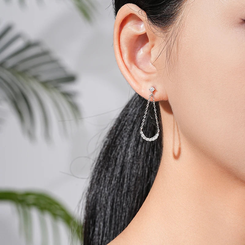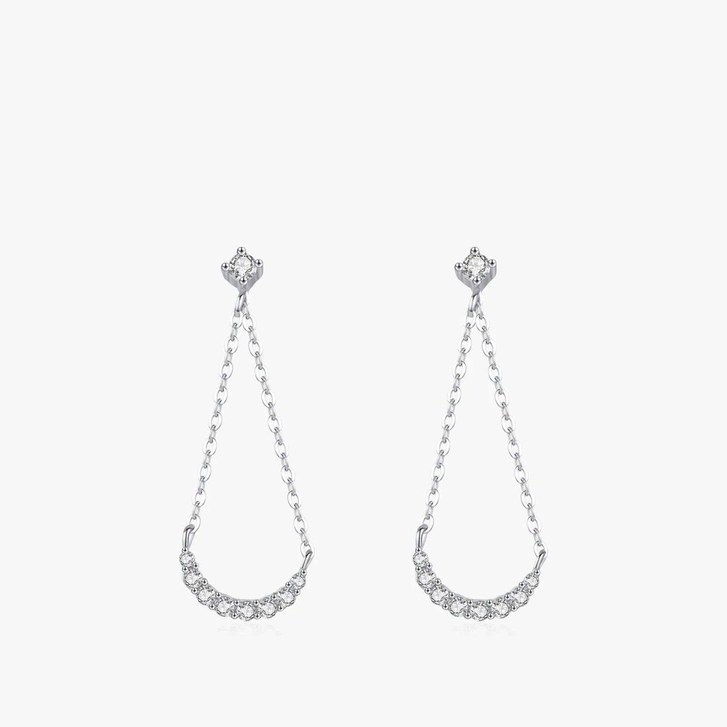 Réalisées en argent 925 certifié, elles présentent un design pendant en forme géométrique orné de zircones et de cristaux scintillants, idéales pour les mariages, fiançailles et événements raffinés.
